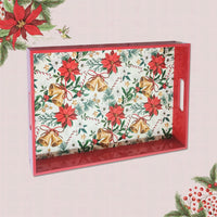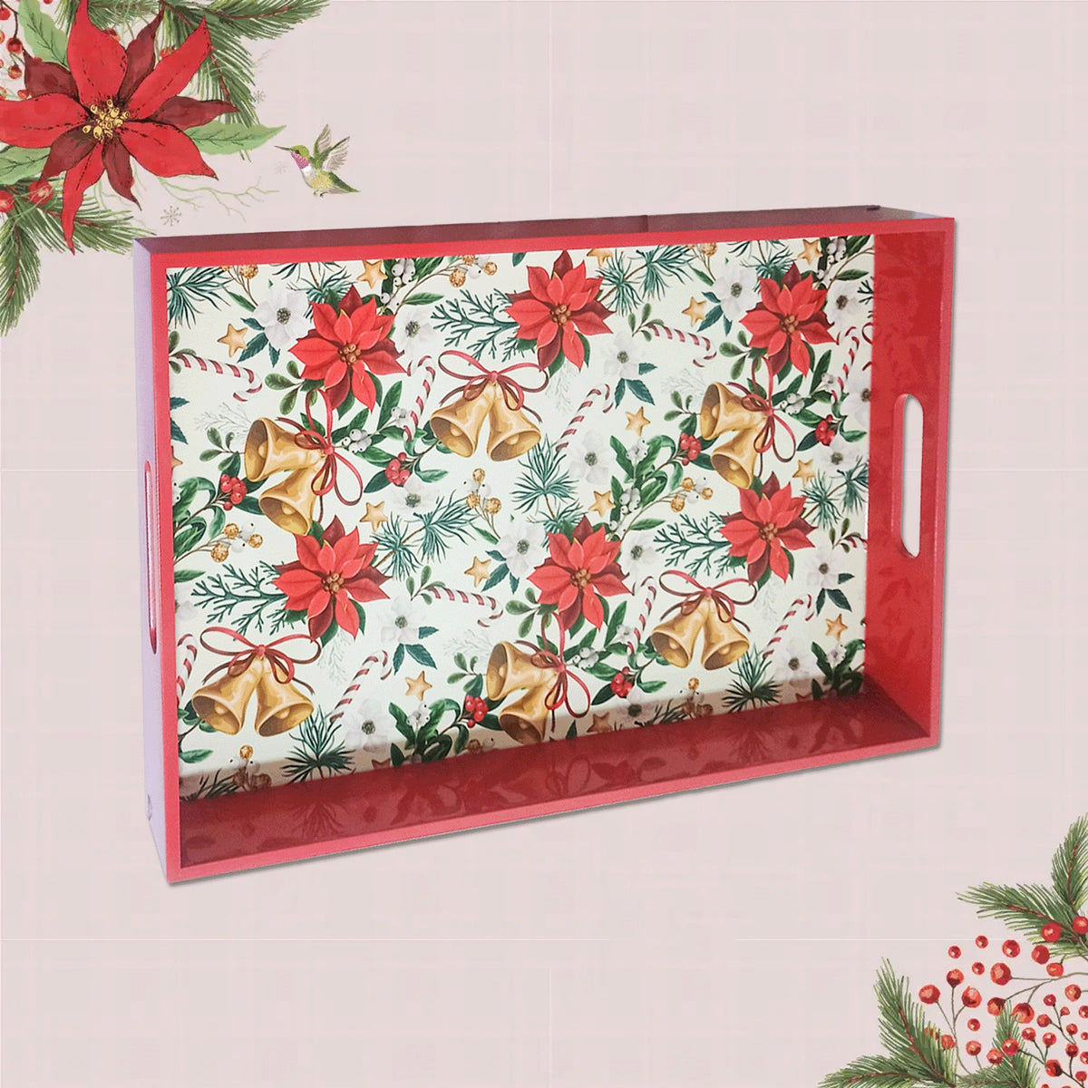 Spread holiday cheer with the Christmas Bells Decorative Tray! This delightful tray features a festive design of golden bells, candy canes & lush green pine sprigs, perfectly capturing the essence of Christmas. Crafted from durable MDF, this tray has a beautiful lacquer finish. It serves not only as a functional piece for serving refreshments but also as a stunning decorative accent.