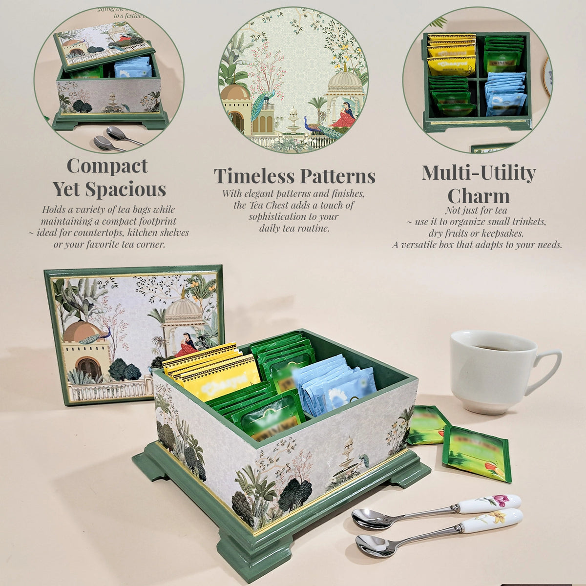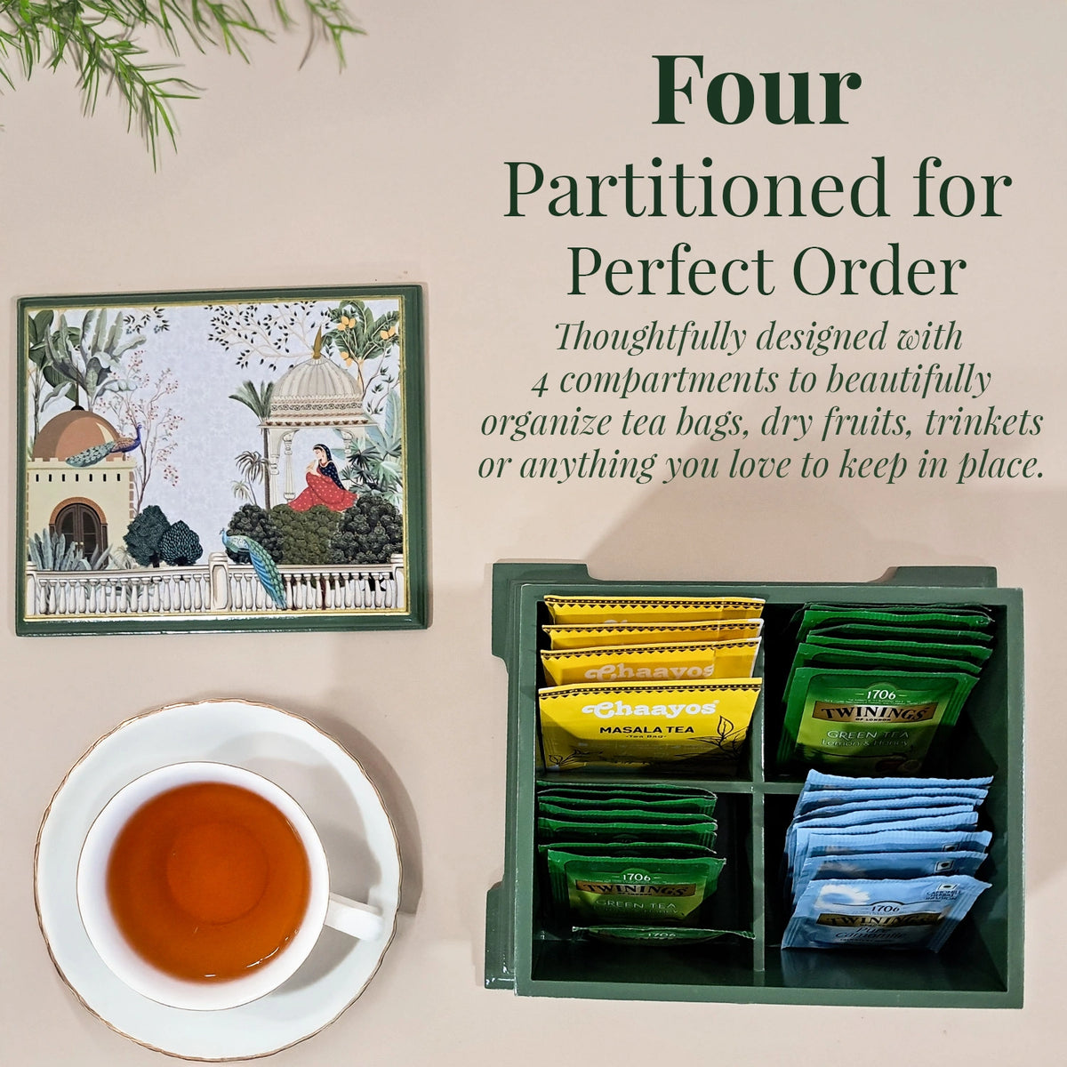Handcrafted out of high quality MDF with love & care, this lacquered wooden tea chest features four compartments to hold your favorite blends.