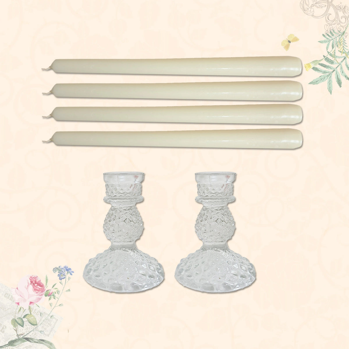 Add a touch of timeless elegance to your space with our Premium Ivory Taper Candle Set, thoughtfully curated with four handcrafted unscented taper candles and two graceful glass holders. Their classic ivory hue complements any décor, making them ideal for intimate dinners, weddings, or everyday gatherings at home.