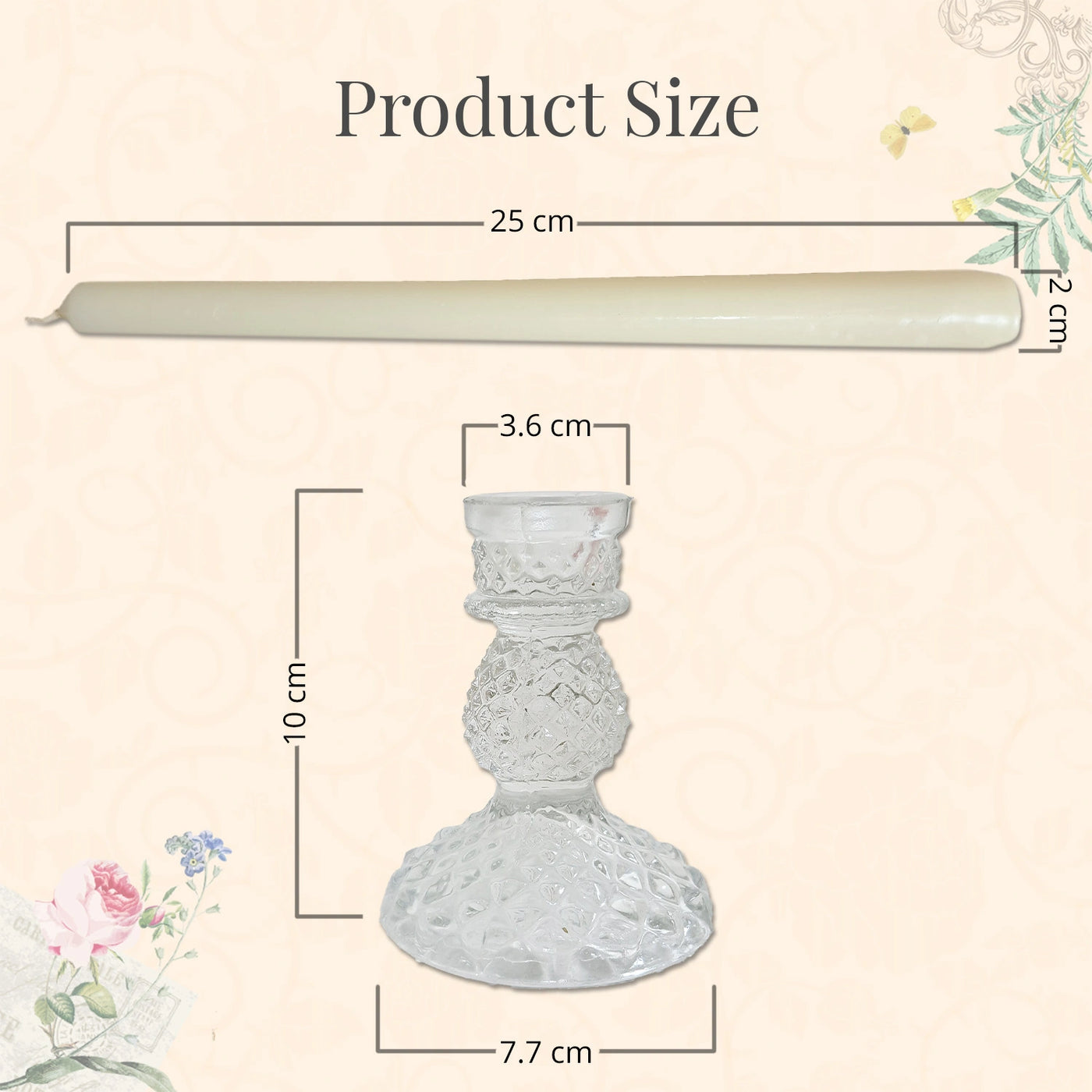 Each candle is made from high-quality wax, designed to offer a smooth, even burn with minimal smoke and dripping, ensuring a clean and refined ambience. Measuring 25 x 2 cm, the candles fit beautifully into candelabras, candle stands, and centerpieces. The matching holders (10 x 7.7 x 3.6 cm) add an extra touch of sophistication, allowing you to style them effortlessly across your tablescapes.
