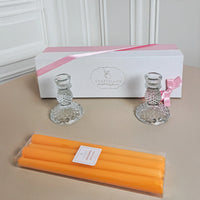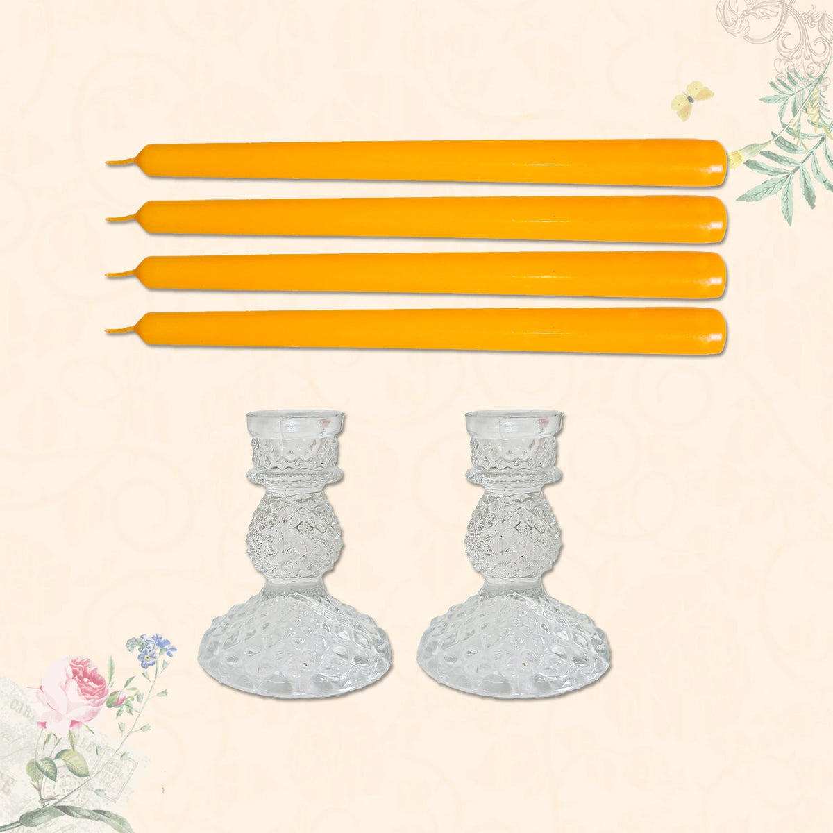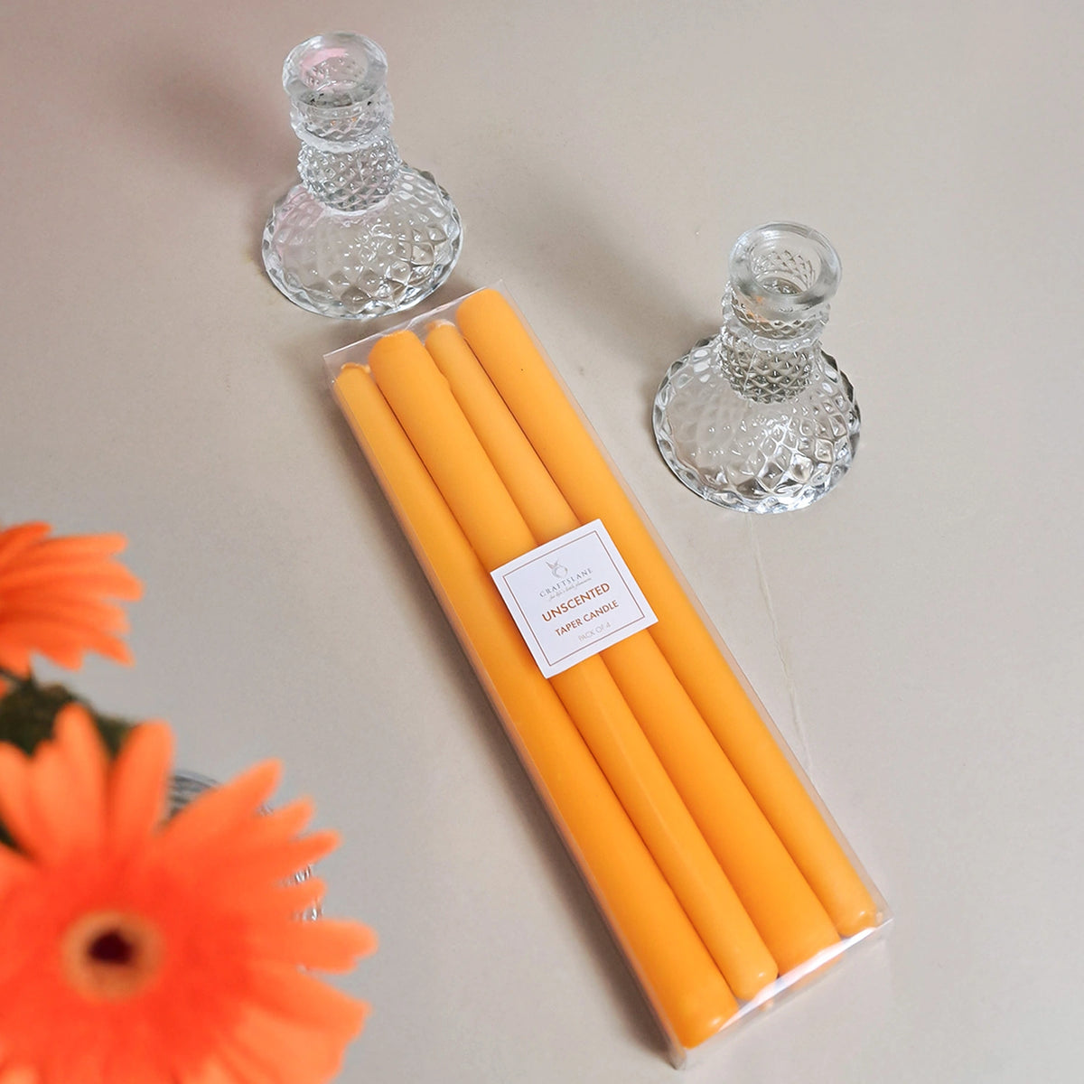 Infuse your celebrations with warmth and radiance with our Premium Marigold Taper Candle Set, complete with four handcrafted unscented taper candles and two glass holders. With their rich orange glow, these candles bring brightness and cheer to festive occasions, family dinners, or everyday décor. Made from refined wax, each candle offers a clean, steady burn with minimal smoke or dripping. Measuring 25 x 2 cm, they are the perfect size for candle holders, candelabras, and centerpieces.