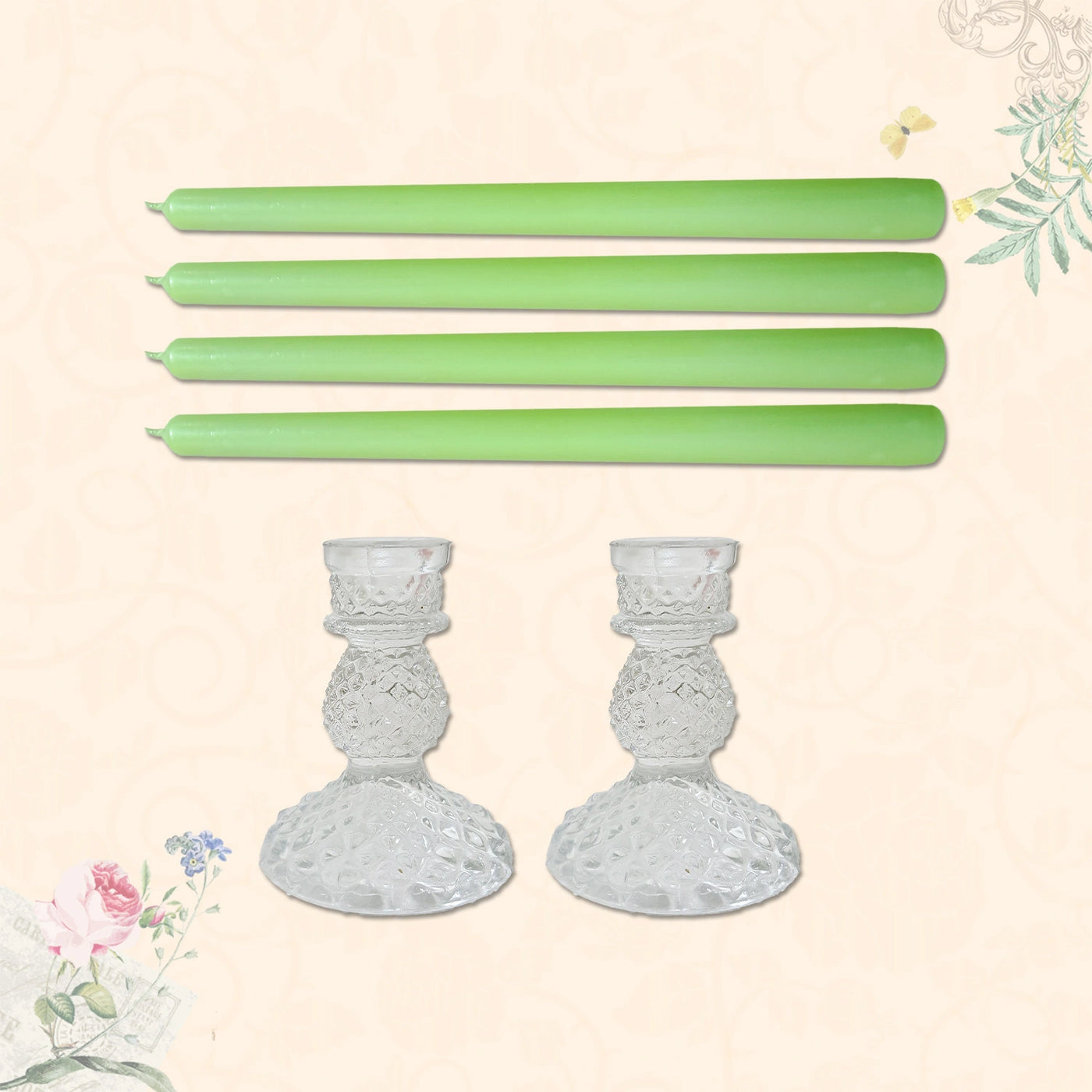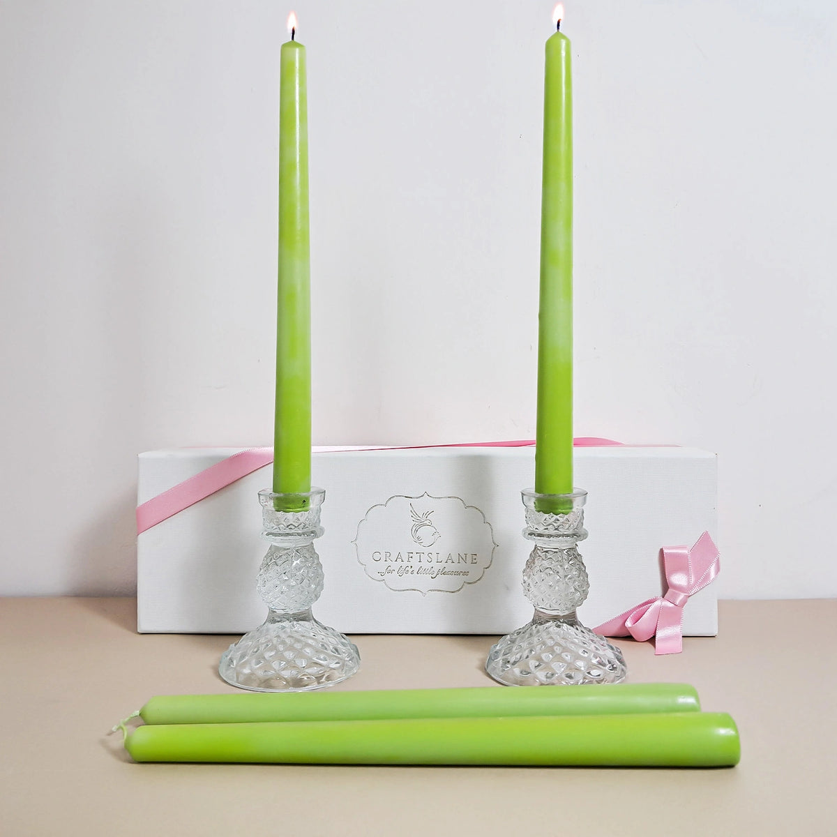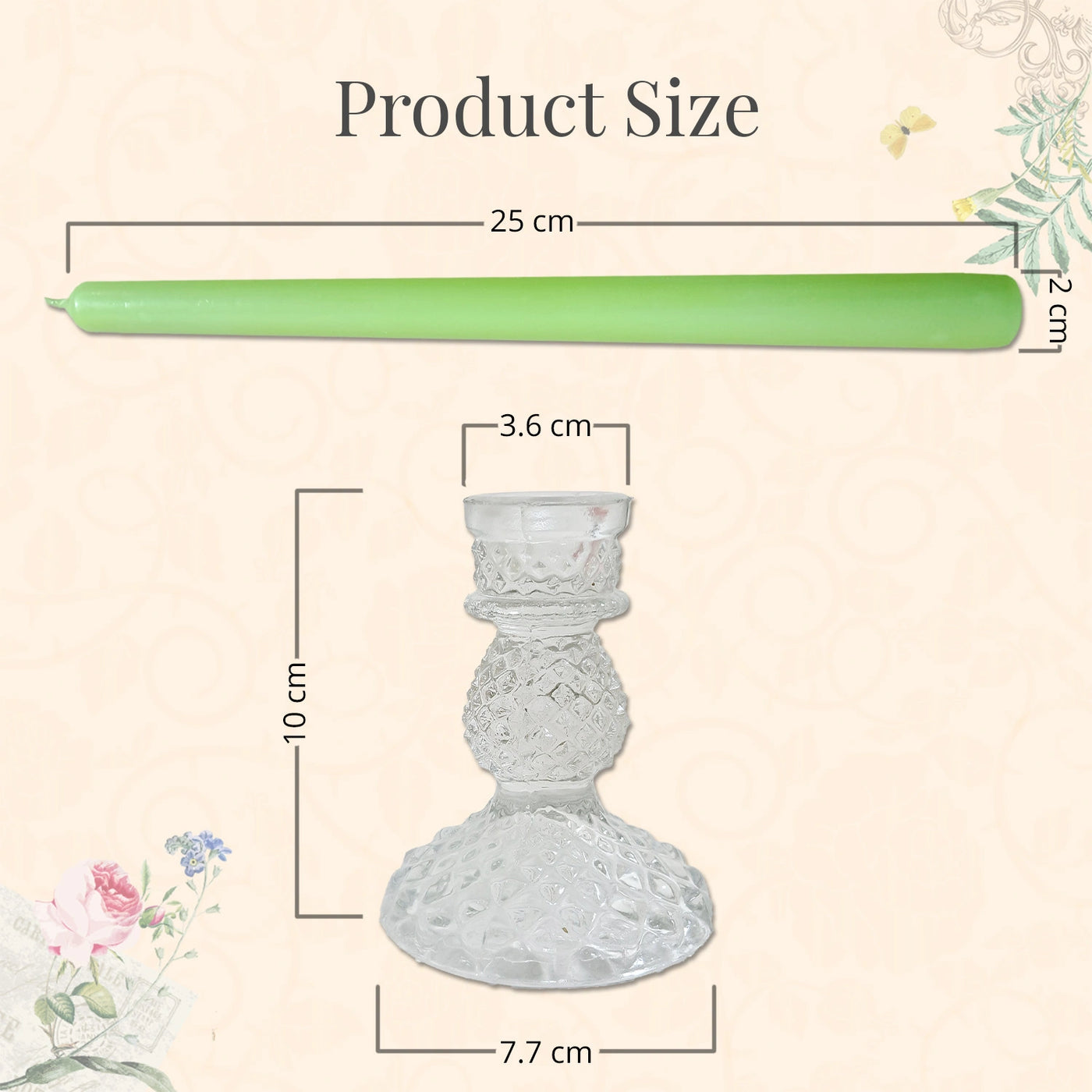 Celebrate calm and sophistication with our Premium Sage Taper Candle Set, which includes four unscented taper candles and two glass holders. Their soft, muted green tone brings a sense of serenity, making them perfect for elegant tablespaces, garden-inspired décor, or festive celebrations. Crafted from high-quality wax, these candles burn evenly with little smoke or dripping, ensuring a neat and graceful display.