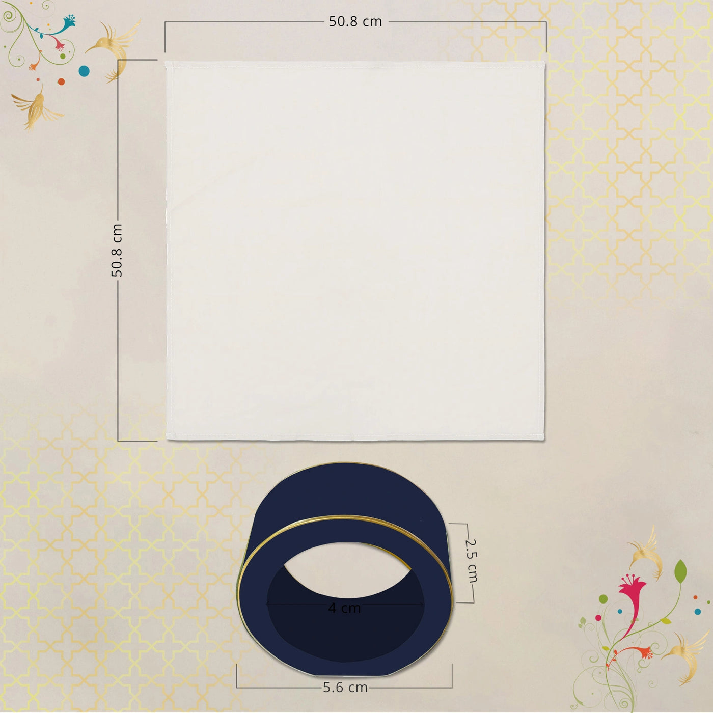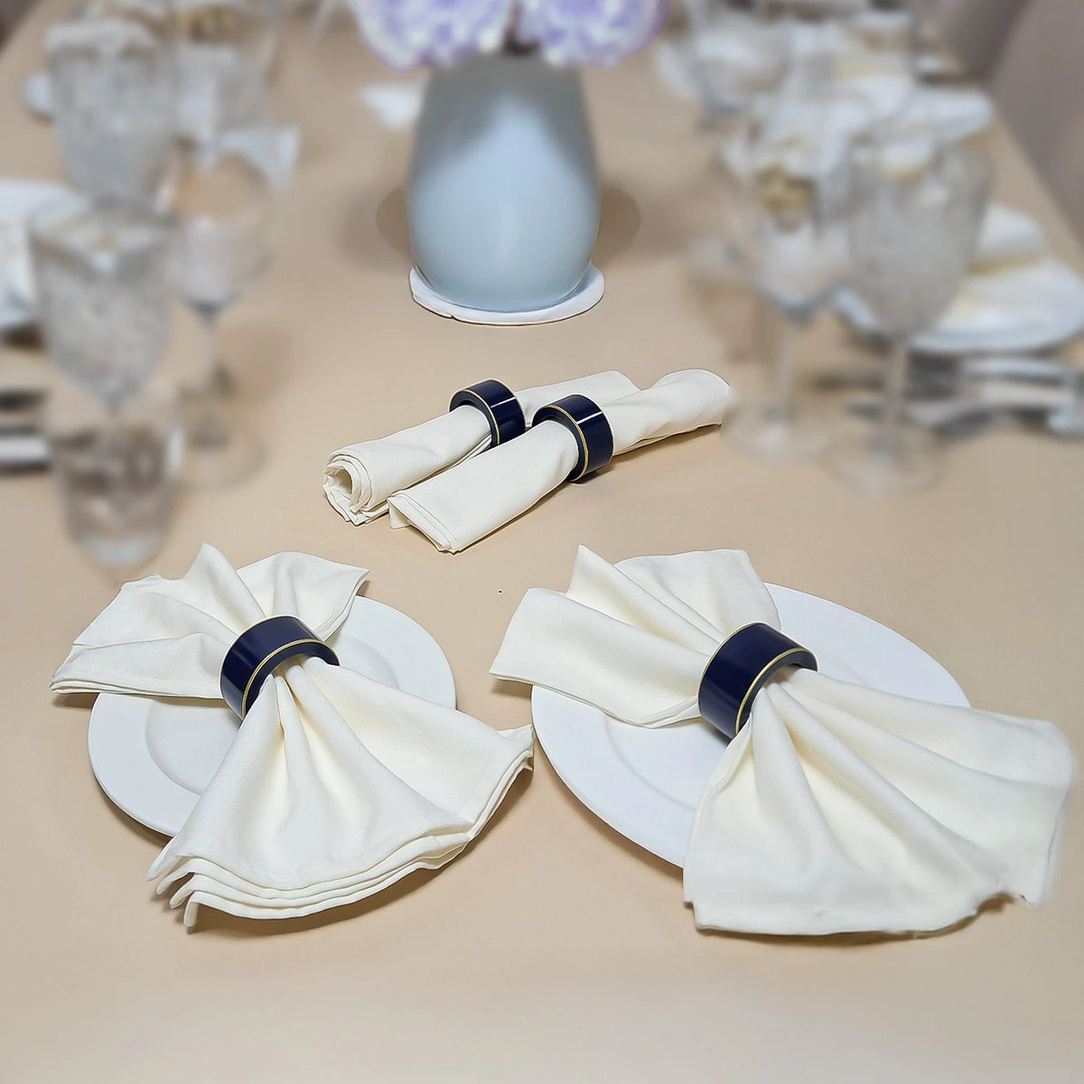 Radiate royalty and sophistication with the Sapphire Blue Napkin Rings. The deep navy blue hue, framed with a luxurious gold rim, creates an opulent and timeless appeal. Perfect for formal dining, holiday feasts and elegant events, this napkin ring is a showstopper on any table. Teamed with the soft luxurious cream colored napkins which are a part of this set, they complete the entire dining experience beautifully!