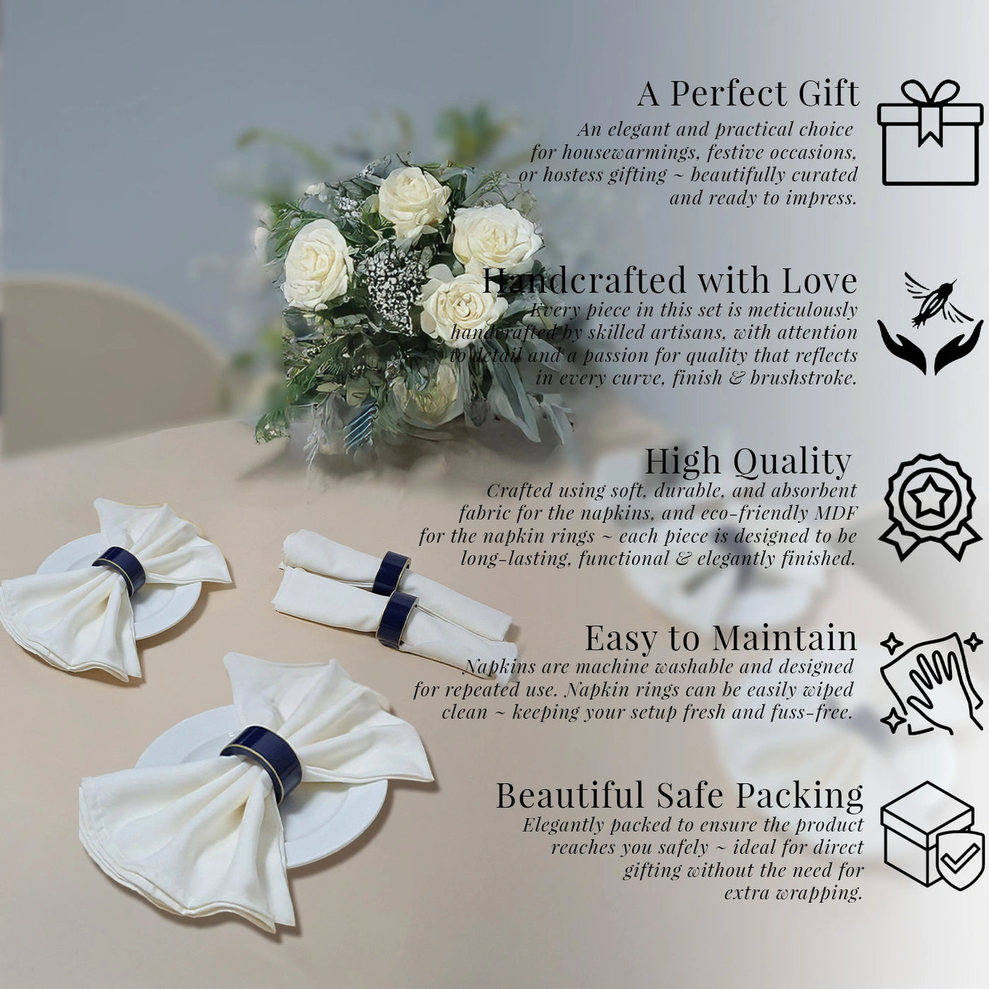 The 5.5 x 5.5 cm size and 4 cm inner diameter ensure a flawless fit for your napkins, making it a stylish yet practical choice. The Napkin Rings, designed with care using responsibly sourced MDF ~ bring beauty to your table and kindness to the planet. The soft cream colored napkins are made out of high quality cotton rayon, and open to a luxurious size of 20" x 20"