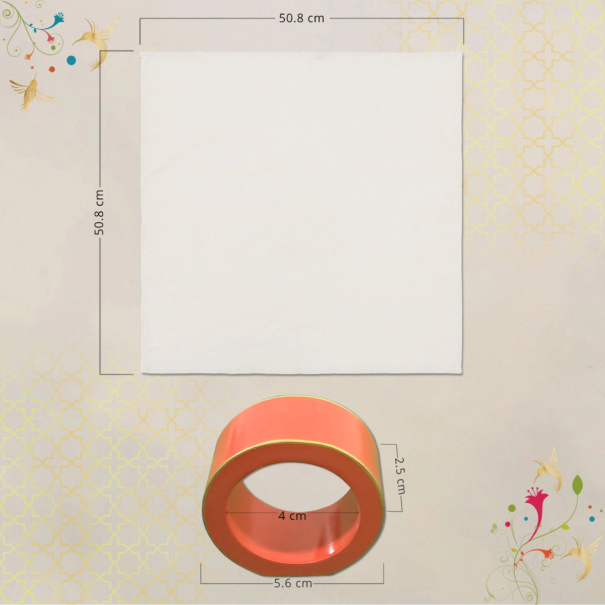 - Napkin rings: Approx 2.2" outer diameter. Napkins: Approx 20" x 20"