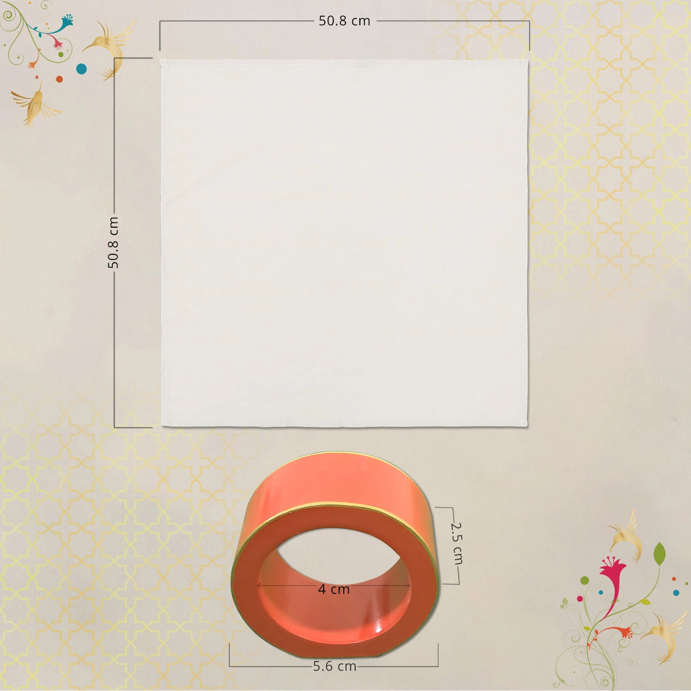 The 5.5 x 5.5 cm size and 4 cm inner diameter ensure a flawless fit for your napkins, making it a stylish yet practical choice. The Napkin Rings, designed with care using responsibly sourced MDF ~ bring beauty to your table and kindness to the planet. The soft cream colored napkins are made out of high quality cotton rayon, and open to a luxurious size of 20" x 20"