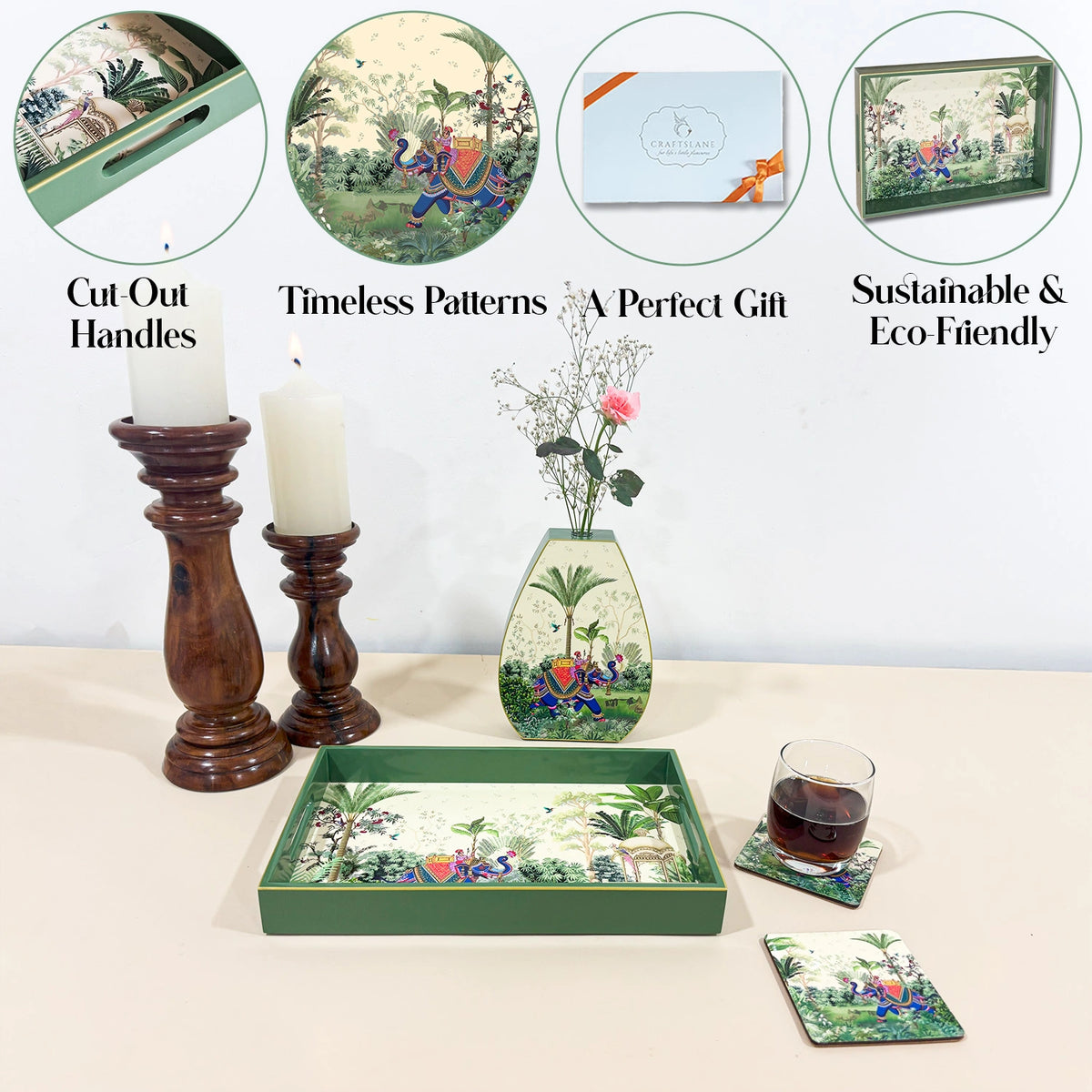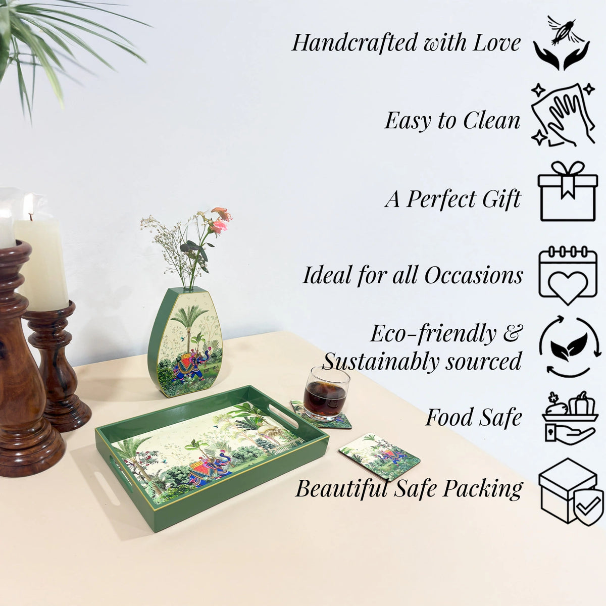 This design features layered botanical motifs and regal charm, making it perfect for luxury hampers, spiritual ceremonies, festive décor, or even serving evening snacks. Handcrafted with premium MDF and sealed in a lacquer finish, it offers both form and function.